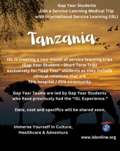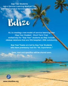 All of the gap year experiences will vary dependent on program selected, country, language spoken in chosen country, timeline, etc., but the common denominator of all 3 are the opportunities to meet, shadow, and collaborate with a variety of healthcare practitioners which we hope will help to solidify their choice of study in graduate school. Additionally, another common denominator is the opportunity to have more hospital or clinical site time with a goal of 75% clinical hospital rotations and 25% rural/urban community clinic rotations. Due to the existing rules and regulations of the healthcare systems in the countries where ISL serves, we are limited in where we can create the Gap Year Student experience that includes a hospital rotation … to date the countres that will allow us to provide this experience are: Belize / Mexico / Tanzania
